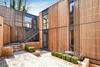 The site was home to a collection of Victorian buildings, which were retained along the street frontage and converted for residential use. At the rear, a two-storey flat roof extension with associated bin and cycle stores wraps around the perimeter retaining walls of the courtyard, which is dug into the hillside. A lightweight steel and timber frame was chosen due to access restrictions and a need to clarify site levels while providing adequate screening. This construction technique was adopted as the buildings design language.